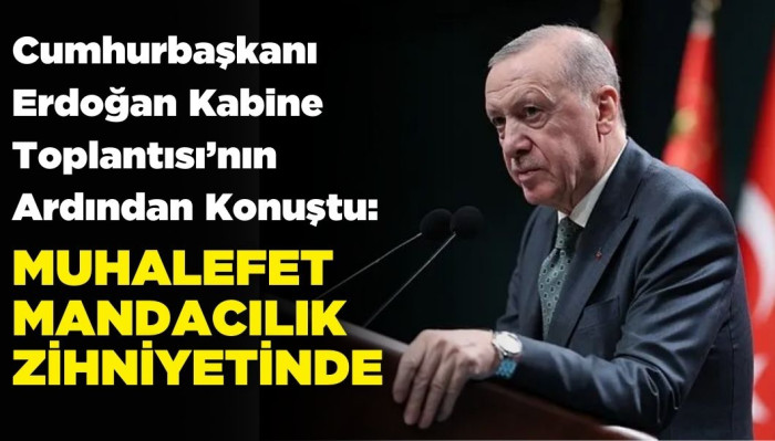 Cumhurbaşkanı Recep Tayyip Erdoğan, Cumhurbaşkanlığı Külliyesi’nde gerçekleştirilen Kabine Toplantısı’nın ardından konuştu. Erdoğan, "Biz Türkiye'nin itibarını küresel ölçekte artırmaya çalışıyoruz. Muhalefet mandacılık zihniyetinde... Ana muhalefetin Türkiye'nin nereden nereye geldiğini anlaması zaten imkansızdır." ifadeleriyle muhalefeti eleştirdi.