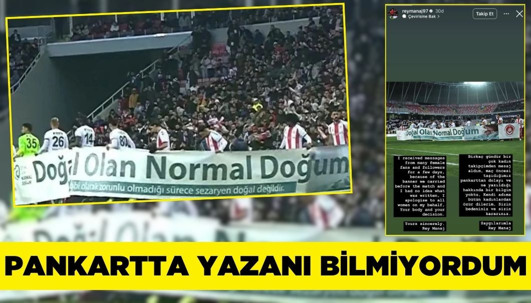 Pazar günü oynanan Sivasspor-Fenerbahçe maçında açılan, 'Doğal olan normal doğum' pankartına tepkiler sürüyor. Sivasspor'un kadrosunda oynayan Arnavut futbolcu Rey Manaj, sosyal medyadan yaptığı paylaşımda, "Kendi adıma bütün kadınlardan özür dilerim, sizin bedeniniz ve sizin kararınız" ifadelerini kullandı.