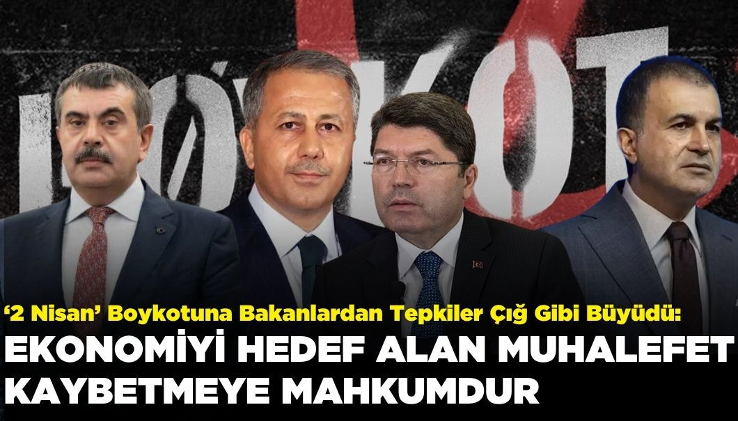CHP'nin Cumburbaşkanı adayı Ekrem İmamoğlu'nun tutuklanmasıyla şiddetlenen protestoları destekleyenler, bugün (2 Nisan) ülke genelinde satın alım yapmayarak boykot yapacak. CHP lideri Özgür Özel ve cezaevindeki İmamoğlu da boykot çağrılarına destek vermişti. Öte yandan, boykot çağrısına AK Partili Ömer Çelik, Cumhurbaşkanı Yardımcısı Cevdet Yılmaz ve bakanlardan tepkiler çığ gibi büyüdü. Bakan Yerlikaya, satın almama çağrısını 'ekonomiye yapılan bir darbe girişimi' olarak niteledi.