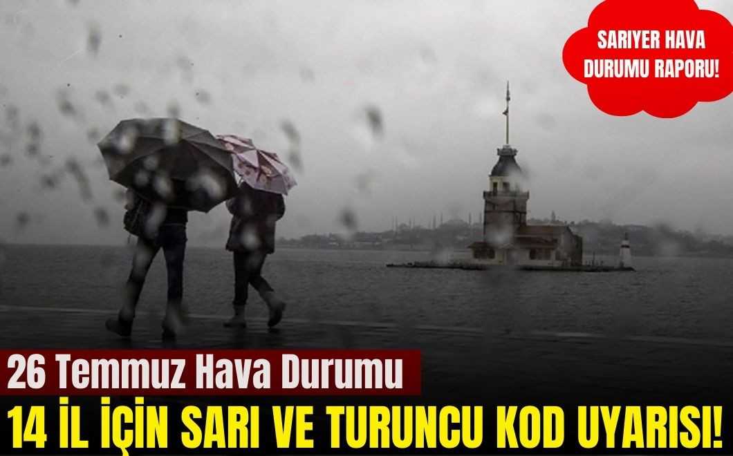 Meteoroloji Genel Müdürlüğü (MGM) 26 Temmuz Cuma gününe ilişkin hava durumu raporunu yayımladı. Verilere göre; İstanbul ve diğer 14 il için turuncu ve sarı kodlu uyarı yayımladı.