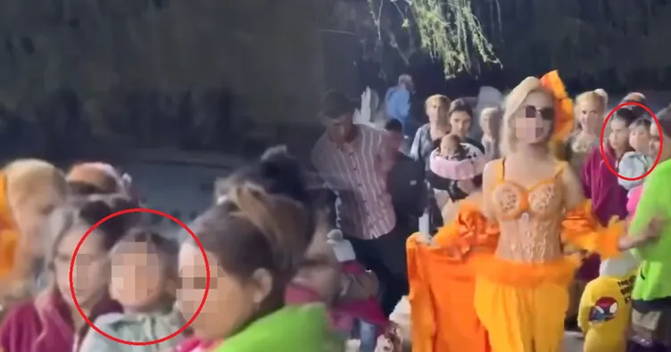 Görüntülerde sokak üzerinde serili bir halının üzerinde dans eden bir kadının arkasında, yakınlarının kucağında bulunan 3 yaşındaki çocuğun sigara içtiği anlar yer aldı.