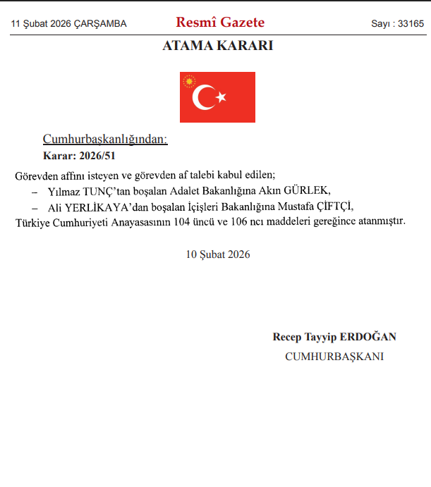 Resmi Gazete'de yayımlanan Cumhurbaşkanlığı atama kararıyla Adalet Bakanlığı’na atanan Akın Gürlek atandı. Devir teslim töreni bugün saat 14.00'te yapılacak.