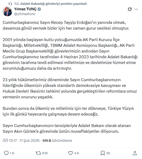 Resmi Gazete'de yayımlanan Cumhurbaşkanlığı atama kararlarıyla yerine Akın Gürlek atanan Adalet Bakanı Yılmaz Tunç, “Cumhurbaşkanımız Sayın Recep Tayyip Erdoğan’ın yanında olmak, davamıza gönül vermek bizler için her zaman gurur vesilesi olmuştur. 2001 yılında başlayan kutlu yolcuğumuzda AK Parti Kurucu İlçe Başkanlığı, Milletvekilliği, TBMM Adalet Komisyonu Başkanlığı, AK Parti Meclis Grup Başkanvekilliği görevlerimizin ardından Sayın Cumhurbaşkanımız tarafından 4 Haziran 2023 tarihinde Adalet Bakanlığı görevinin tarafıma tevdi edilmesi milletimize ve devletimize hizmet etme sorumluluğumuzu daha da artırmıştır. 23 yıllık hükümetlerimiz döneminde Sayın Cumhurbaşkanımızın liderliğinde ülkemizin yüksek standartlı demokrasiye kavuşması ve Hukuk Devleti ilkesinin tahkimi yolunda gerçekleştirilen reformlara omuz vermenin onurunu yaşadık. Bundan sonra da ülkemiz ve milletimiz için ter dökmeye, Türkiye Yüzyılı için ilk günkü heyecanla çalışmaya devam edeceğiz. Sayın Cumhurbaşkanımızın tensipleriyle Adalet Bakanı olarak atanan Sayın Akın Gürlek’e görevinde üstün muvaffakiyetler diliyorum” ifadelerini kullandı.