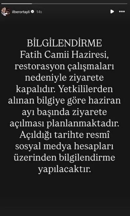 13 Mart tarihinde vefat eden ve Fatih Camii Haziresi’ne defnedilen duayen tarihçi Prof. Dr. İlber Ortaylı’nın kabrini ziyaret etmek isteyen vatandaşlar için ailesi tarafından bilgilendirme yapıldı. Yapılan açıklamada, defin bölgesinin restorasyon çalışmaları sebebiyle geçici bir süre ziyarete kapalı olduğu bildirildi.