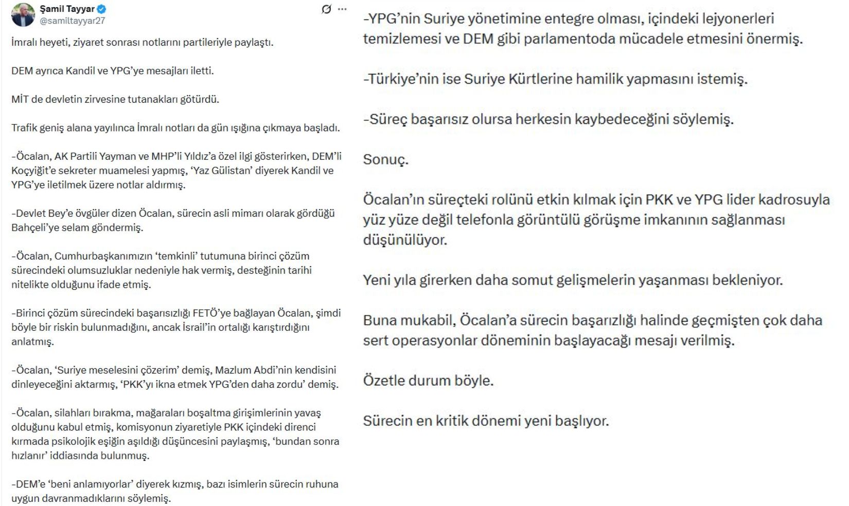 Görüşmenin içeriğine ilişkin herhangi bir resmi açıklama yapılmazken, AK Partili Şamil Tayyar’dan çok konuşulacak bir paylaşım geldi. Tayyar, tutanaklarının 10 sene sonra yayınlanacağı açıklanan ziyaret ile ilgili notların, heyet tarafından AK Parti, MHP ve DEM Parti ile paylaşıldığını belirtti.