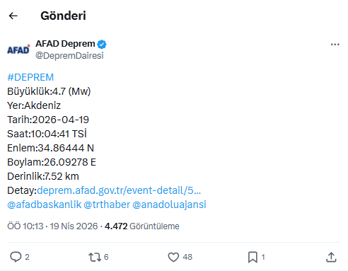 Afet ve Acil Durum Yönetimi Başkanlığı (AFAD) tarafından paylaşılan verilere göre, Akdeniz açıklarında 4.7 büyüklüğünde bir deprem meydana geldi.