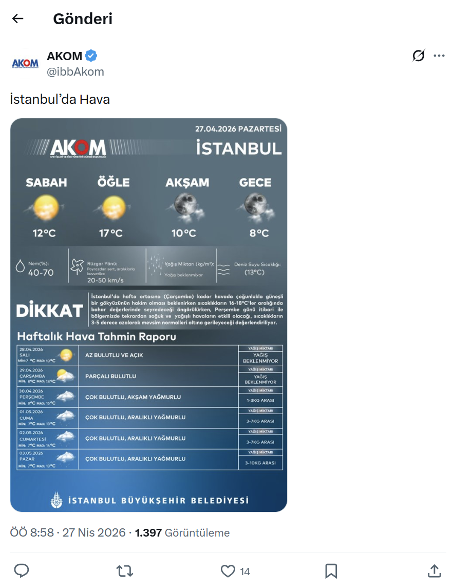 İstanbul Büyükşehir Belediyesi Afet İşleri ve Risk Yönetimi Dairesi Başkanlığı (AKOM), megakent için haftalık hava durumu raporunu yayımladı.