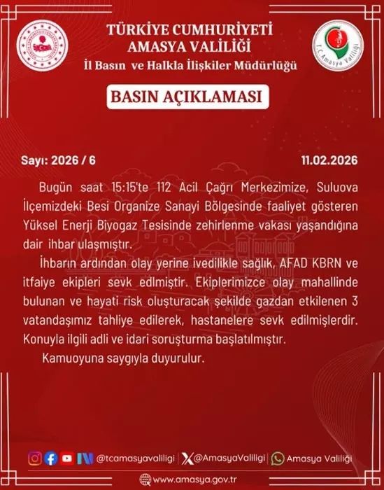 Yapılan açıklamada şu ifadelere yer verildi: “Bugün saat 15:15'te 112 Acil Çağrı Merkezimize, Suluova İlçemizdeki Besi Organize Sanayi Bölgesinde faaliyet gösteren Yüksel Enerji Biyogaz Tesisinde zehirlenme vakası yaşandığına dair ihbar ulaşmıştır. İhbarın ardından olay yerine ivedilikle sağlık, AFAD KBRN ve itfaiye ekipleri sevk edilmiştir. Ekiplerimizce olay mahallinde bulunan ve hayati risk oluşturacak şekilde gazdan etkilenen 3 vatandaşımız tahliye edilerek, hastanelere sevk edilmişlerdir. Konuyla ilgili adli ve idari soruşturma başlatılmıştır. Kamuoyuna saygıyla duyurulur.”