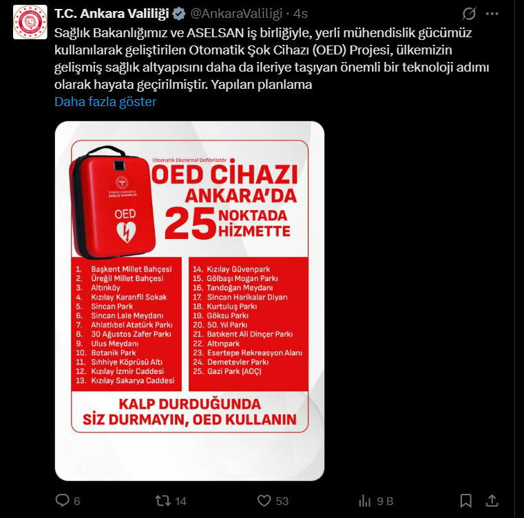 Ankara Valiliği, ani kalp durması vakalarına hızlı ve etkili müdahale edebilmek amacıyla yerli üretim Otomatik Eksternal Defibrilatör (OED) cihazlarının kentin çeşitli noktalarına kurulduğunu duyurdu. ASELSAN ve Sağlık Bakanlığı işbirliğiyle geliştirilen bu cihazlar, ambulans ekipleri ulaşana kadar hayat kurtarıcı bir köprü görevi üstleniyor.