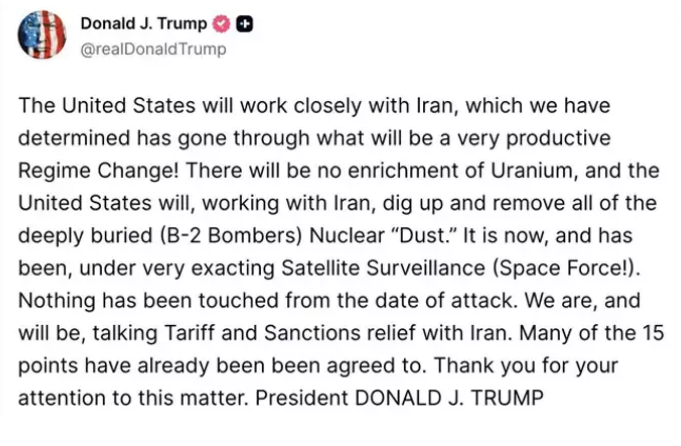 "Amerika Birleşik Devletleri, çok verimli bir Rejim Değişikliği sürecinden geçtiğine karar verdiğimiz İran ile yakın iş birliği içinde çalışacaktır! Uranyum zenginleştirmesi yapılmayacak ve Amerika Birleşik Devletleri, İran ile birlikte çalışarak yerin derinliklerine gömülü tüm nükleer 'tozu' (B-2 Bombardıman Uçakları) çıkarıp ortadan kaldıracaktır. Bu alan şu anda ve zaten son derece hassas uydu gözetimi (Uzay Kuvvetleri!) altındadır. Saldırı tarihinden bu yana hiçbir şeye dokunulmamıştır. İran ile Gümrük Vergisi ve Yaptırımların hafifletilmesi konularını görüşüyoruz ve görüşmeye devam edeceğiz. 15 maddenin çoğu üzerinde zaten mutabakat sağlanmıştır. Bu konuya gösterdiğiniz ilgi için teşekkür ederim. Başkan DONALD J. TRUMP"