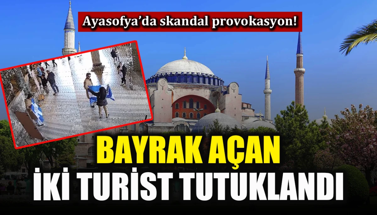 İstanbul’da Ayasofya-i Kebir Cami-i Şerifi'nde "Ya Ortodoks ol ya da öl" yazılı Bizans bayrağı açan iki Yunan turist, polis operasyonuyla yakalandı. Şüpheliler, “halkı kin ve düşmanlığa tahrik” suçlamasıyla tutuklanarak cezaevine gönderildi.