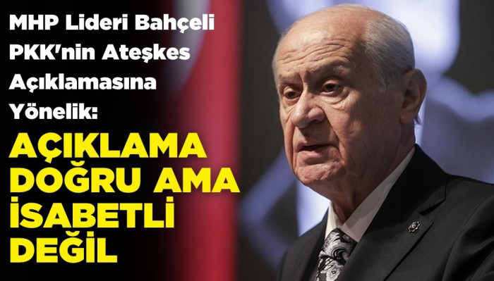 MHP Genel Başkanı Devlet Bahçeli terör örgütü PKK'nin elebaşı Abdullah Öcalan'ın çağrısının ardından, terör örgütünün ateşkes ilan etmesine yönelik açıklamada bulundu. Bahçeli, "Terör örgütünün açıklaması doğru ama isabetli bir açıklama değil. PKK terör örgütü ve iltisaklı gruplar derhal silah bırakmalıdır" dedi.