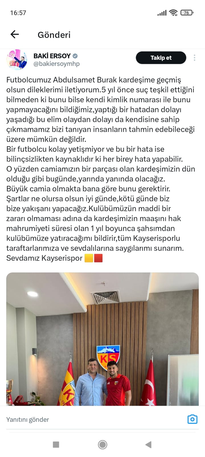 Kayserispor’un maddi zarara uğratılmaması için 1 yıllık maaşı karşılayacağını söyleyen Ersoy, “Futbolcumuz Abdulsamet Burak kardeşime geçmiş olsun diliyorum. Beş yıl önce, suç teşkil ettiğini bilmeden yaptığı bir hatadan dolayı bugün böyle bir durumla karşı karşıya kaldı. Bu bilinçsizlikten kaynaklanan bir hatadır ve her birey hata yapabilir. Bir futbolcu kolay yetişmiyor. Camiamızın parçası olan kardeşimizin dün olduğu gibi bugün ve yarın da yanında olacağız. Şartlar ne olursa olsun iyi günde kötü günde biz bize yakışanı yaparız. Kulübümüzün maddi bir zarara uğramaması adına, hak mahrumiyeti süresi olan bir yıl boyunca kardeşimizin maaşını şahsımdan kulübümüze yatıracağımı bildiriyorum. Sevdamız Kayserispor” ifadelerini kullandı.
