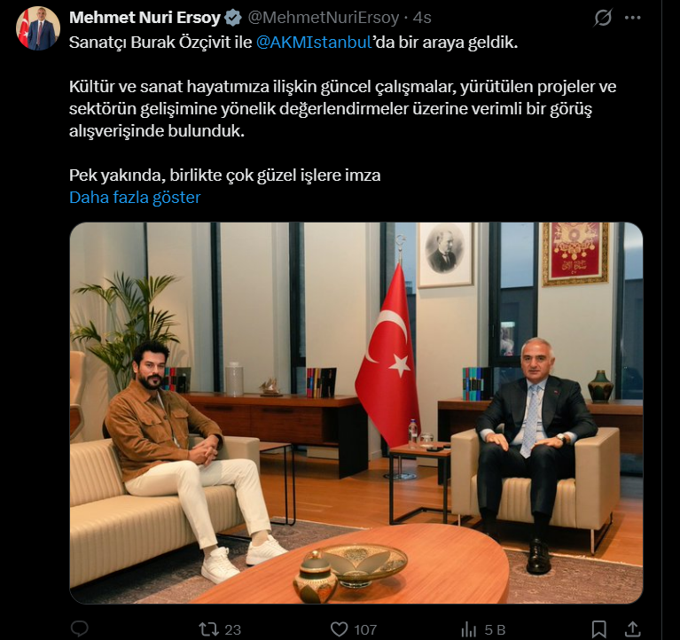 Ünlü oyuncu Burak Özçivit, Kültür ve Turizm Bakanı Mehmet Nuri Ersoy ile İstanbul Atatürk Kültür Merkezi’nde (AKM) bir araya geldi. Bakan Ersoy, gerçekleşen bu buluşmaya dair bilgileri resmi sosyal medya hesabından yaptığı bir paylaşım ile aktardı. Görüşmenin ana odağının kültür ve sanat hayatına dair güncel konular, yürütülmekte olan projeler ve sektörün gelişimine yönelik değerlendirmeler olduğu belirtildi.