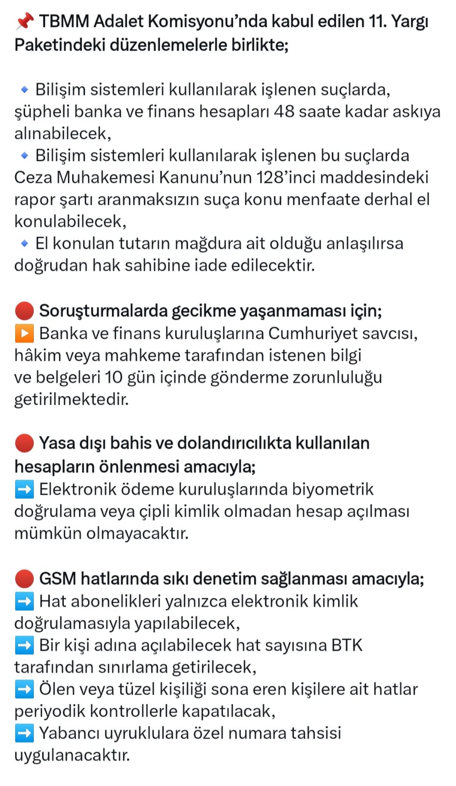 11. Yargı Paketi’ndeki düzenlemelerle, bilişim sistemleri kullanılarak işlenen suçlarda, şüpheli banka ve finans hesaplarının 48 saate kadar askıya alınabileceğini belirten Bakan Tunç, “Bilişim sistemleri kullanılarak işlenen bu suçlarda Ceza Muhakemesi Kanunu'nun 128'inci maddesindeki rapor şartı aranmaksızın suça konu menfaate derhal el konulabilecek, el konulan tutarın mağdura ait olduğu anlaşılırsa doğrudan hak sahibine iade edilecektir. Soruşturmalarda gecikme yaşanmaması için banka ve finans kuruluşlarına, cumhuriyet savcısı, hakim veya mahkeme tarafından istenen bilgi ve belgeleri 10 gün içinde gönderme zorunluluğu getirilmektedir. Yasa dışı bahis ve dolandırıcılıkta kullanılan hesapların önlenmesi amacıyla elektronik ödeme kuruluşlarında biyometrik doğrulama veya çipli kimlik olmadan hesap açılması mümkün olmayacaktır” ifadelerini kullandı.