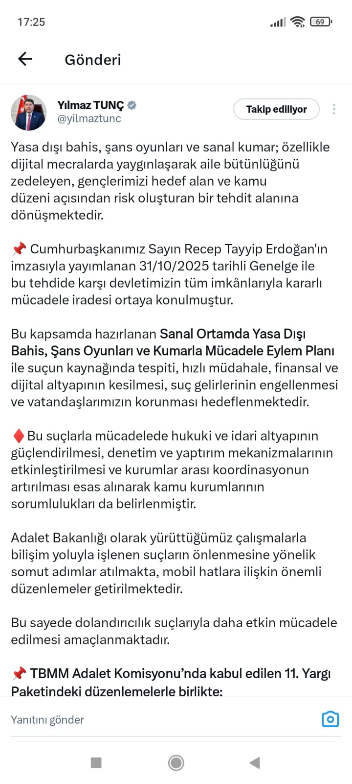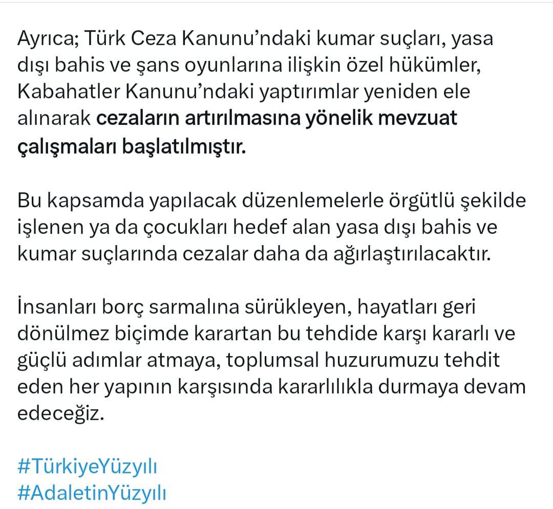Sosyal hesabından paylaşım yapan Adalet Bakanı Yılmaz Tunç, kumar suçları, yasa dışı bahis ve şans oyunlarına ilişkin özel hükümler ve Kabahatler Kanunu'ndaki yaptırımların artırılması için çalışma yaptıklarını belirtti.