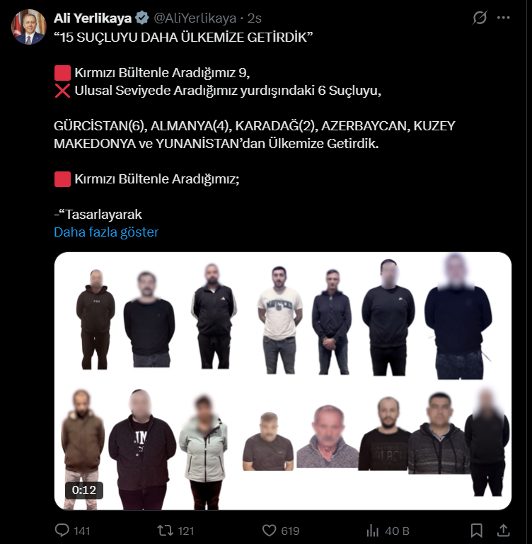 İçişleri Bakanı Ali Yerlikaya, sosyal medya platformu X üzerinden yaptığı açıklamada, firari durumda bulunan şahısların yakalanarak Türkiye’ye getirildiğini kamuoyuna duyurdu. Toplamda 15 kişinin Türkiye'ye iade edildiği belirtilen açıklamada, bu şahıslardan dokuzunun Interpol tarafından kırmızı bültenle arandığı, altısının ise ulusal düzeyde arama kaydının bulunduğu bilgisi paylaşıldı. Getirilen şahısların farklı ülkelerde tespit edilerek ilgili makamlarla eş güdümlü şekilde operasyonların tamamlandığı bildirildi.