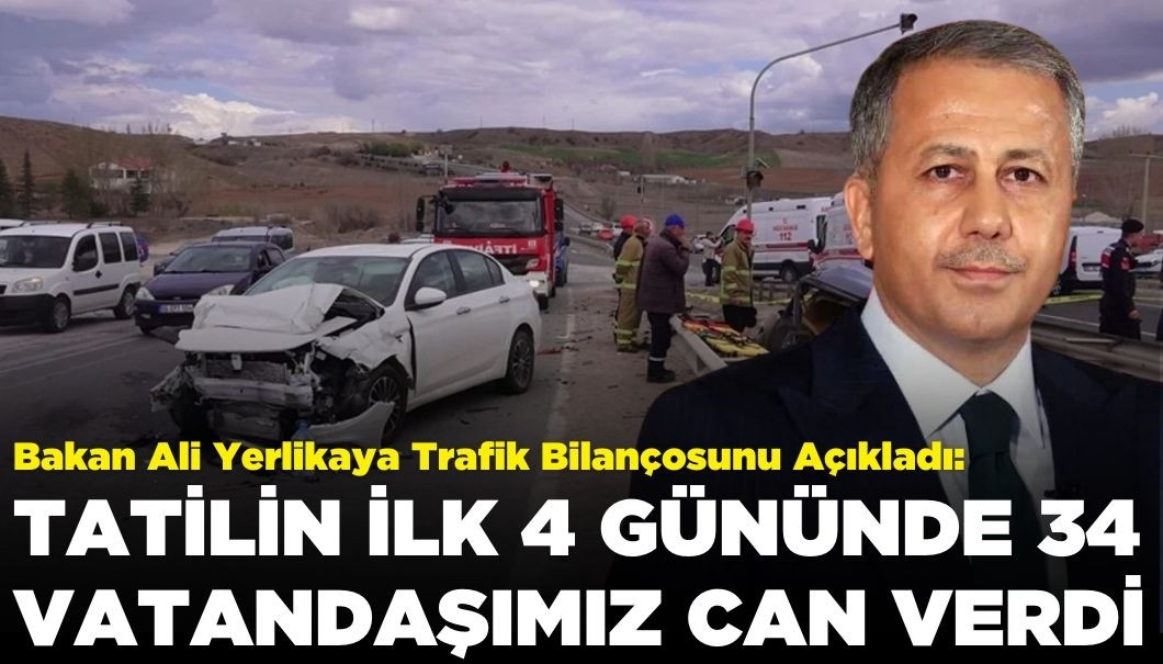 İçişleri Bakanı Yerlikaya, Ramazan Bayramı tatilinin ilk 4 gününde yaşanan trafik kazalarında 34 kişinin hayatını kaybettiğini, 4 bin 784 kişinin ise yaralandığını açıkladı. Yerlikaya, trafikte denetimlerin devam ettiğini belirtti.