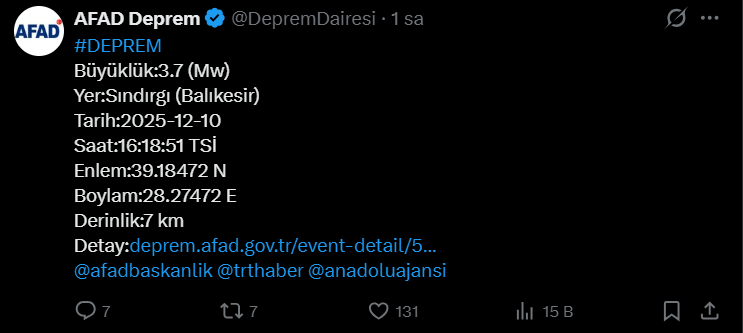 Afet ve Acil Durum Yönetimi Başkanlığı (AFAD) verilerine göre, Balıkesir'de kısa süre aralıklarla 3.9 ve 3.7 büyüklüğünde iki ayrı deprem yaşandı. Depremlerin merkez üssü Sındırgı ilçesi olarak kaydedildi.