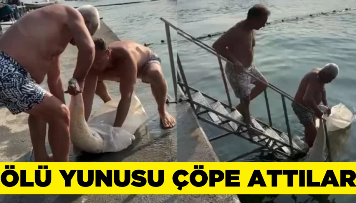 Çevredekiler tarafından denizden çıkarılan yunus, bir poşete konularak çöp konteynerine atıldı. O anlar cep telefonu kamerasıyla kaydedildi.