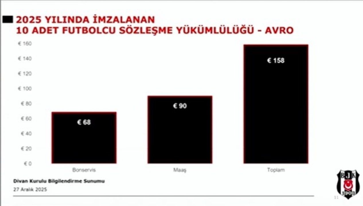 Beşiktaş’ın 2025 yılında sözleşme imzalanan 10 futbolcuya karşı sözleşme yükümlülüğü de açıklandı. Buna göre sporculara 68 milyon Euro öderken, maaş yükümlülüğü ise 90 milyon Euro oldu.