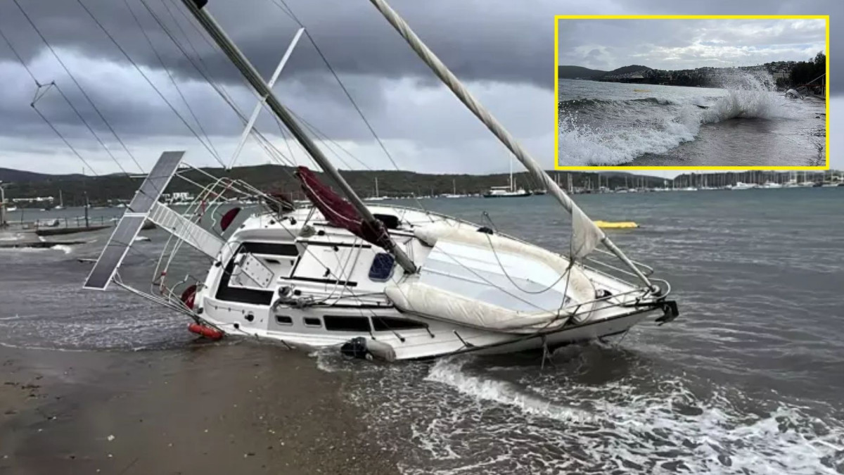 Bodrum’da fırtınadan dolayı yelkenli tekne karaya oturdu, feribot seferleri iptal edildi.
