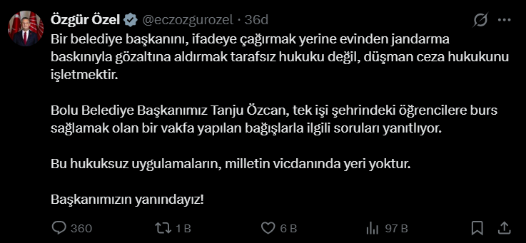 Gelişmelerin ardından CHP Genel Başkanı Özgür Özel, sosyal medya platformu X üzerinden bir açıklama yaparak duruma tepki gösterdi. Özel açıklamasında şu ifadelere yer verdi: "Bir belediye başkanını, ifadeye çağırmak yerine evinden jandarma baskınıyla gözaltına aldırmak tarafsız hukuku değil, düşman ceza hukukunu işletmektir. Bolu Belediye Başkanımız Tanju Özcan, tek işi şehrindeki öğrencilere burs sağlamak olan bir vakfa yapılan bağışlarla ilgili soruları yanıtlıyor. Bu hukuksuz uygulamaların, milletin vicdanında yeri yoktur. Başkanımızın yanındayız!"