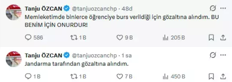 Gözaltı sürecine dair sosyal medya hesabı üzerinden açıklamada bulunan Bolu Belediye Başkanı Tanju Özcan, yaşanan durumu şu sözlerle kamuoyuna duyurdu: "Jandarma tarafından gözaltına alındım. Memleketimde binlerce öğrenciye burs verildiği için gözaltına alındım. Bu benim için onurdur!"