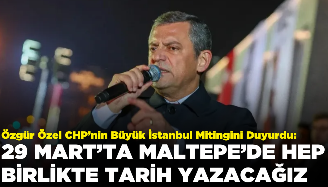 CHP lideri Özgür Özel, cumartesi günü Maltepe'de gerçekleşmesi planlanan büyük mitingi duyurdu. Mitingin 29 Mart Cumartesi saat 12.00'de Maltepe'de yapılacağı öğrenildi.