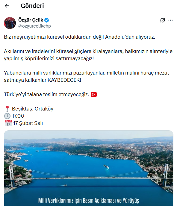 17 Şubat Salı günü saat 17.00'te Beşiktaş Ortaköy'den başlayıp Beşiktaş Arnavutköy'e kadar yürüyeceklerini duyuran Özgür Çelik, "Biz meşruiyetimizi küresel odaklardan değil Anadolu’dan alıyoruz" dedi.