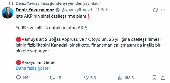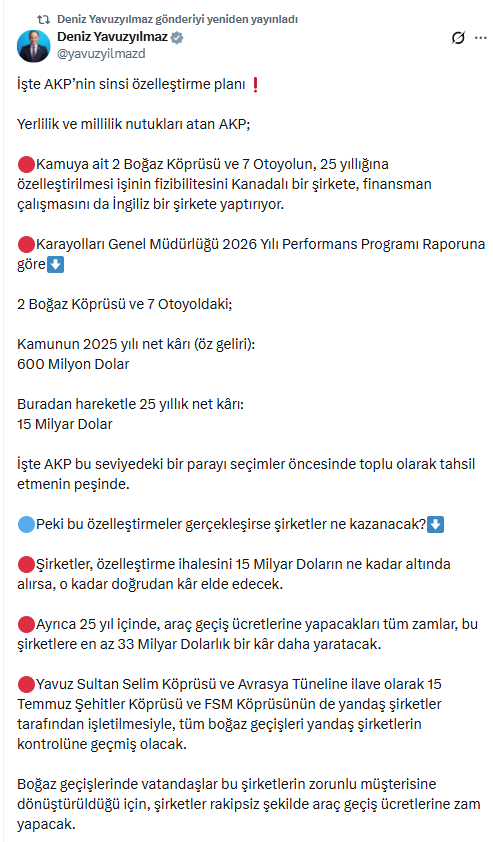 CHP Genel Başkan Yardımcısı Deniz Yavuzyılmaz, geçtiğimiz günlerde sosyal medyasından yaptığı açıklamada, AK Parti’nin, kamuya ait 2 boğaz köprüsü ile 7 otoyolun 25 yıllığına özelleştirilmesine yönelik çalışmalara tepki gösterdi. Yavuzyılmaz, "Yerlilik ve millilik nutukları atan AKP; Kamuya ait 2 boğaz köprüsü ve 7 otoyolun, 25 yıllığına özelleştirilmesi işinin fizibilitesini Kanadalı bir şirkete, finansman çalışmasını da İngiliz bir şirkete yaptırıyor. Karayolları Genel Müdürlüğü 2026 Yılı Performans Programı Raporuna göre 2 Boğaz Köprüsü ve 7 Otoyoldaki; Kamunun 2025 yılı net kârı (öz geliri): 600 Milyon Dolar. Buradan hareketle 25 yıllık net karı: 15 Milyar Dolar. İşte AKP bu seviyedeki bir parayı seçimler öncesinde toplu olarak tahsil etmenin peşinde.