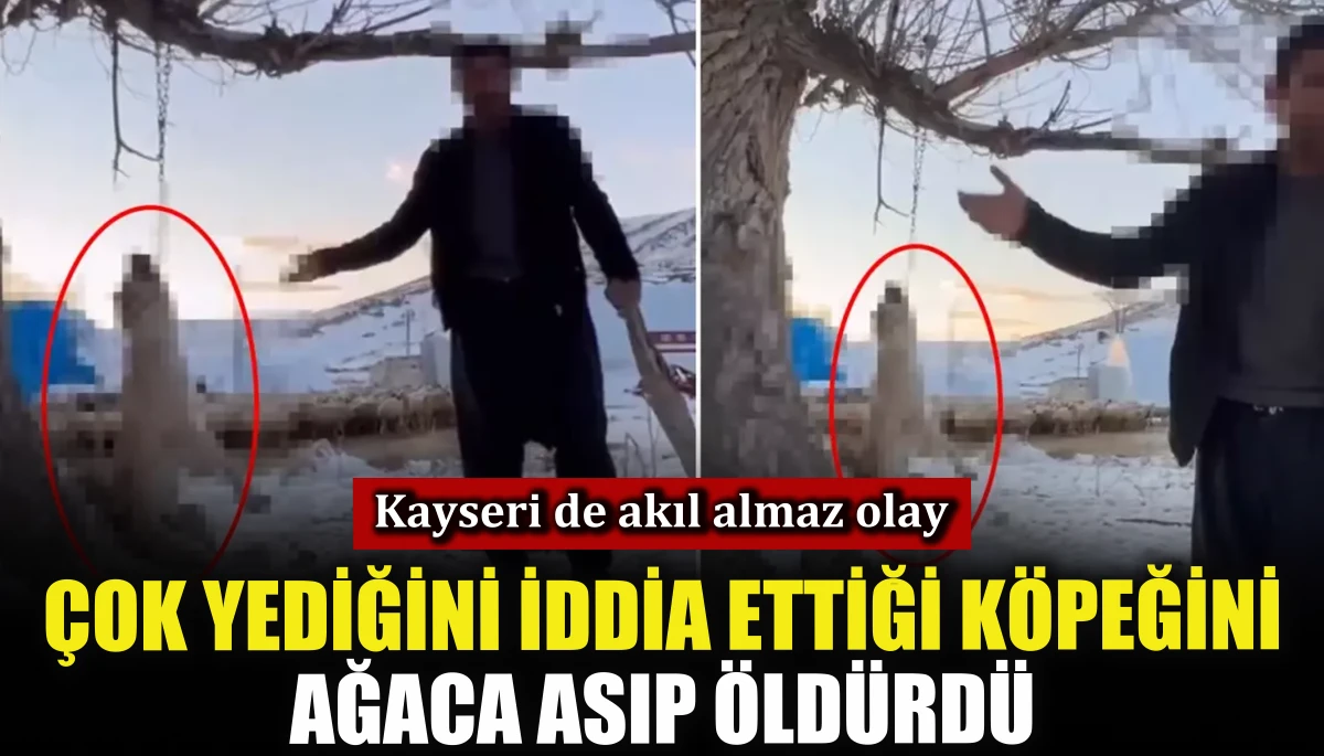 Kayseri’nin Pınarbaşı ilçesinde kimliği belirsiz kişi, çok fazla yediğini iddia ettiği köpeğini ağaca asarak öldürdü.