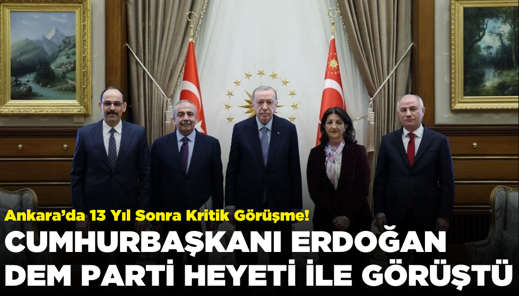 'Terörsüz Türkiye' sürecine ilişkin Ankara'da kritik bir görüşme gerçekleşti. Cumhurbaşkanı Recep Tayyip Erdoğan, 13 yıl sonra ilk kez DEM Parti heyeti ile görüştü. Görüşmede MİT Başkanı İbrahim Kalın, AK Parti Genel Başkanvekili Efkan Ala ve DEM Parti heyetinden Sırrı Süreyya Önder ile Pervin Buldan yer aldı. Görüşme 1 saat 25 dakika sürdü.