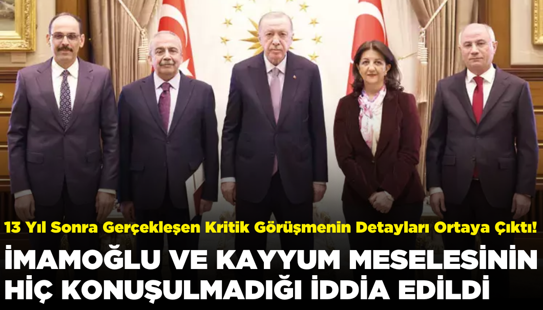 Cumhurbaşkanı Recep Tayyip Erdoğan ile DEM Parti heyetinin dün (10 Nisan) Ankara'da gerçekleştirdiği kritik görüşmenin detayları ortaya çıktı. 1 saat 25 dakika süren görüşmede Ekrem İmamoğlu ve kayyum meselelerinin hiç konuşulmadığı öne sürüldü.
