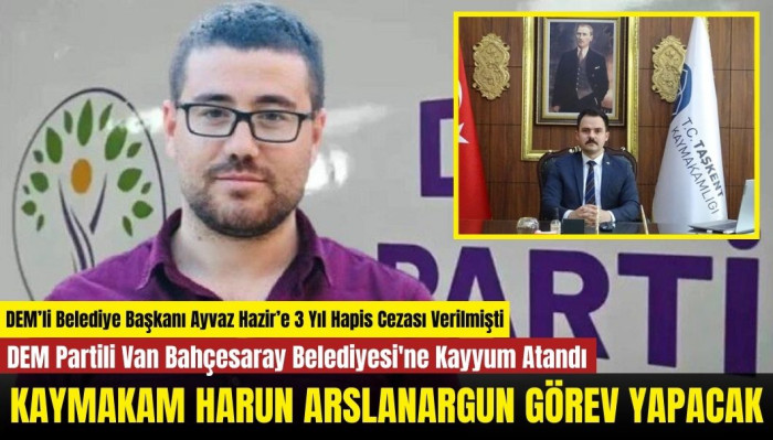 Van Bahçesaray Belediye Başkanı Ayvaz Hazir, 'terör örgütüne üye olmak ve onlar adına suç işlemek' suçundan 3 yıl 5 ay hapis cezasına çarptırılmıştı. Kaymakam Harun Arslanargun, DEM Partili Van Bahçesaray Belediyesi'ne kayyum olarak atandı.
