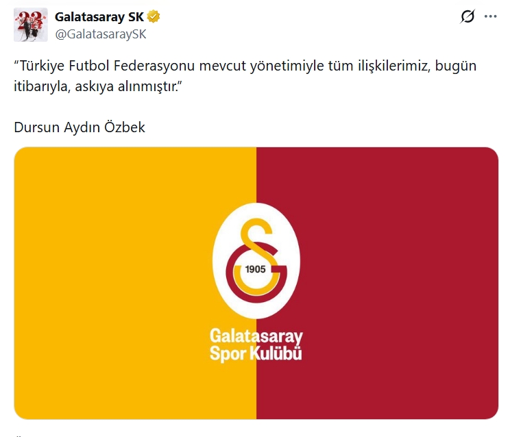 Hakem atamasına tepki gösteren Galatasaray, “Türkiye Futbol Federasyonu mevcut yönetimiyle tüm ilişkilerimiz, bugün itibarıyla, askıya alınmıştır” paylaşımını yapmıştı.