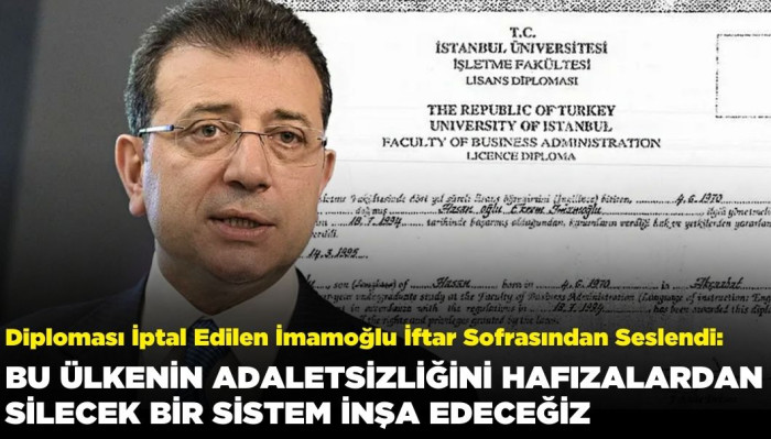 İstanbul Üniversitesi'nin yaptığı açıklama ile diplomasının iptal edildiği öğrenilen İBB Başkanı Ekrem İmamoğlu, konuk olduğu iftar sofrasından açıklamada bulundu. İmamoğlu, "Kendimi millete emanet ediyorum. Bu yapılanın muhattabı artık Ekrem değil, milletimizdir" ifadesini kullandı.