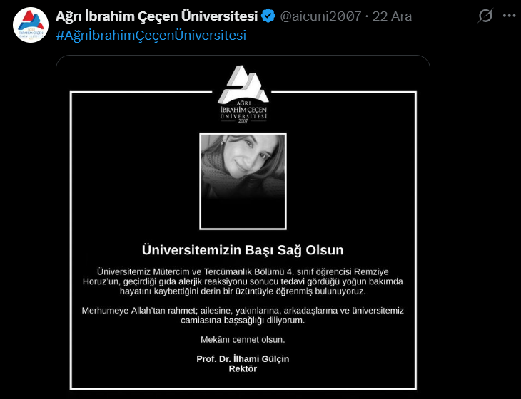 Remziye Horuz’un vefatı, eğitim gördüğü Ağrı İbrahim Çeçen Üniversitesi'nde büyük bir üzüntüyle karşılandı. Üniversite Rektörü Prof. Dr. İlhami Gülçin, yayımladığı taziye mesajında şu ifadeleri kullandı: "Üniversitemiz Mütercim Tercümanlık Bölümü 4. sınıf öğrencisi Remziye Horuz'un geçirdiği gıda alerjik reaksiyonu sonucu tedavi gördüğü yoğun bakımda hayatını kaybettiğini derin bir üzüntüyle öğrenmiş bulunuyoruz. Merhumeye Allah'tan rahmet, ailesine, yakınlarına, arkadaşlarına ve üniversitemiz camiasına başsağlığı diliyorum. Mekanı cennet olsun."