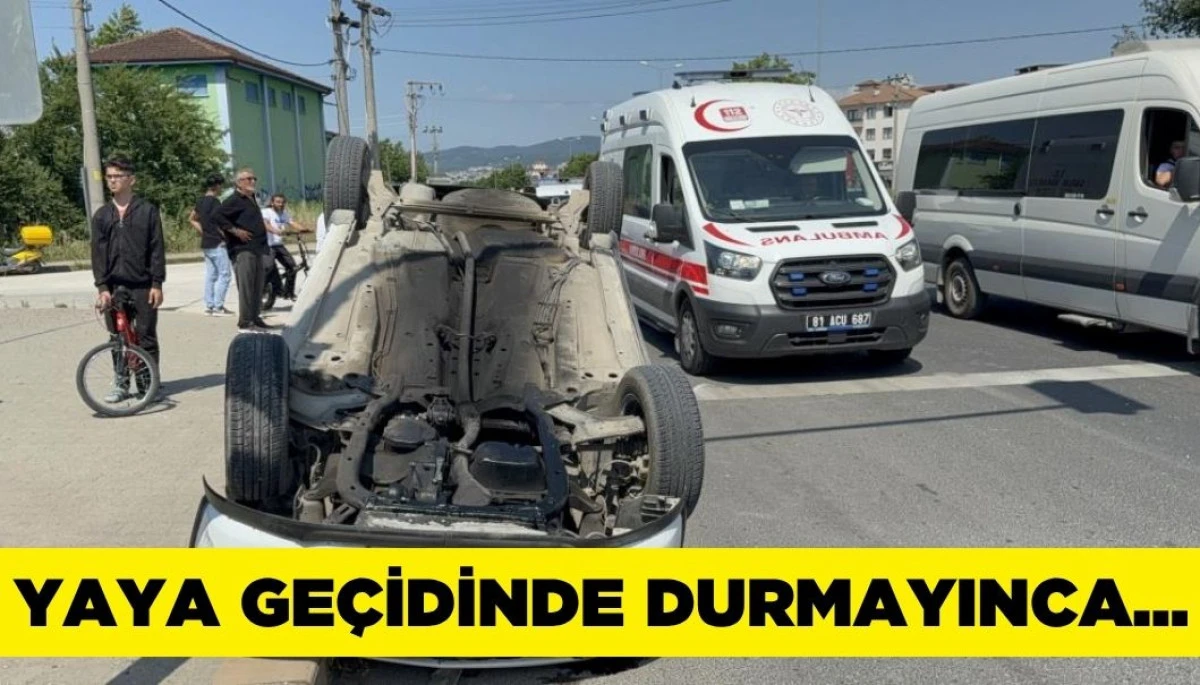 Düzce’de akıl almaz bir kaza meydana geldi. Yaya geçidinde yayaya yol veren araca çarpan otomobil takla attı. Kazada 3 kişi yaralandı.