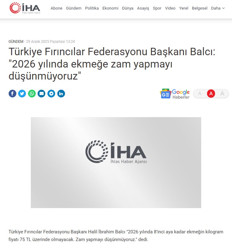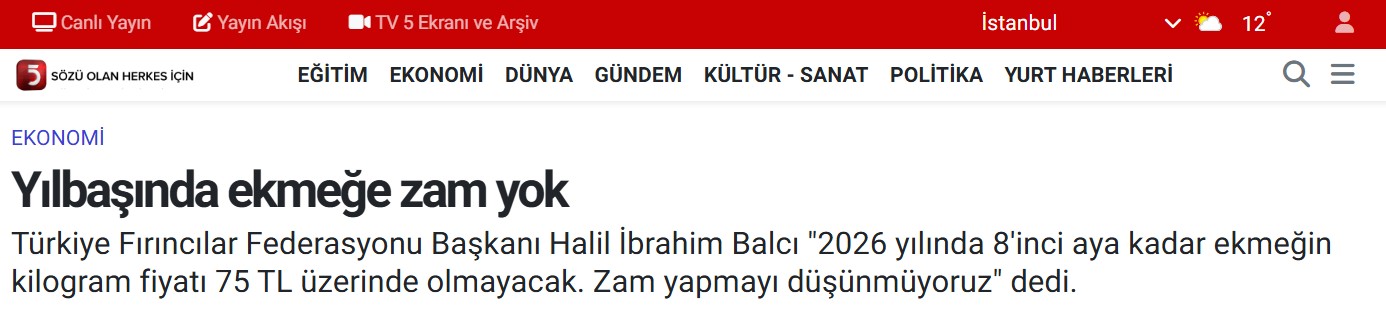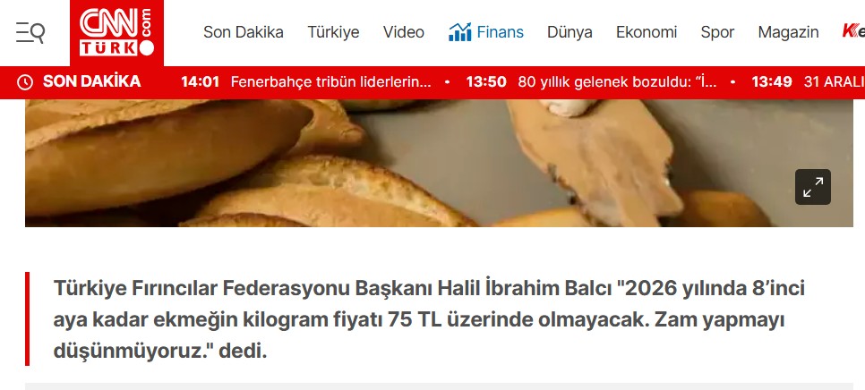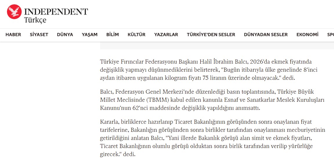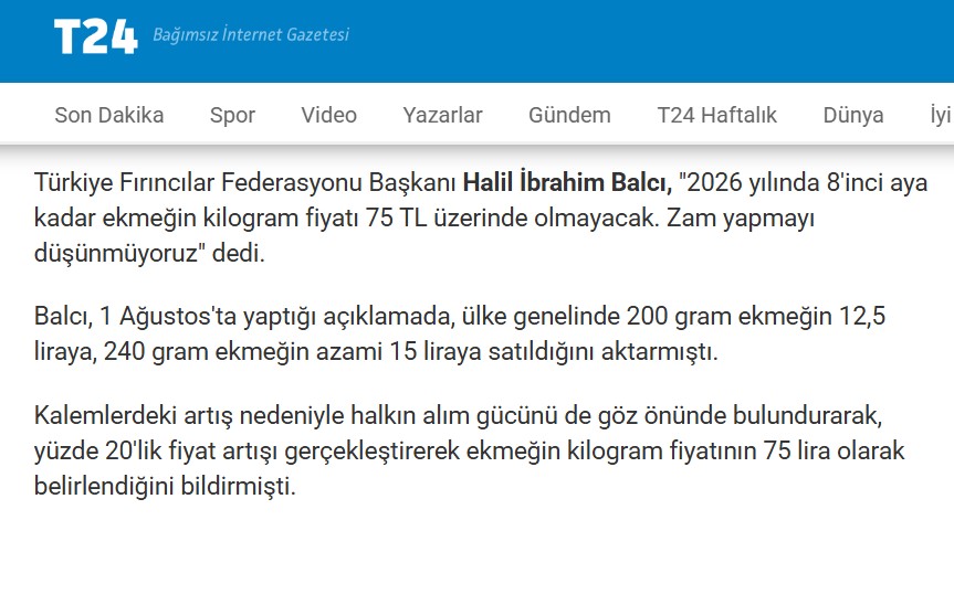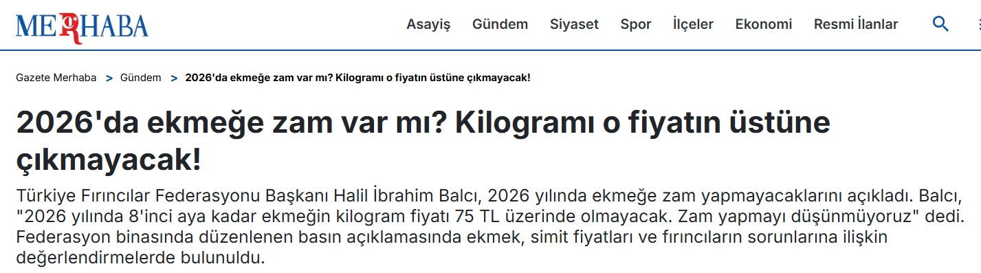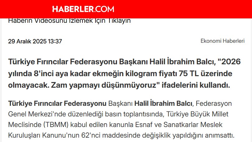 Türkiye Fırıncılar Federasyonu Başkanı Halil İbrahim Balcı ekmek zammına ilişkin dün yaptığı açıklamada, "Bugün itibariyle ekmekte ülke genelinde 8'nci aydan itibaren uygulanan kilogram fiyatı 75 liranın üzerinde olmayacak. 75 liranın altında olan 4 aydır fiyatına gelen farkla yansıtmayan illerimiz bunu yansıtabilirler. Ama 8'nci aydan itibaren işte örnek verecek olursak İzmir'de, Bursa'da, Ankara'da, İstanbul'da, Kocaeli'nde, Sakarya'da birçok vilayette uygulanan fiyat aynı 75 lira olarak devam edecek" ifadelerini kullandı. Bu haber medya kuruluşlarında, "2026 yılında 8’inci aya kadar zam yapmayı düşünmüyoruz" şeklinde yer aldı.