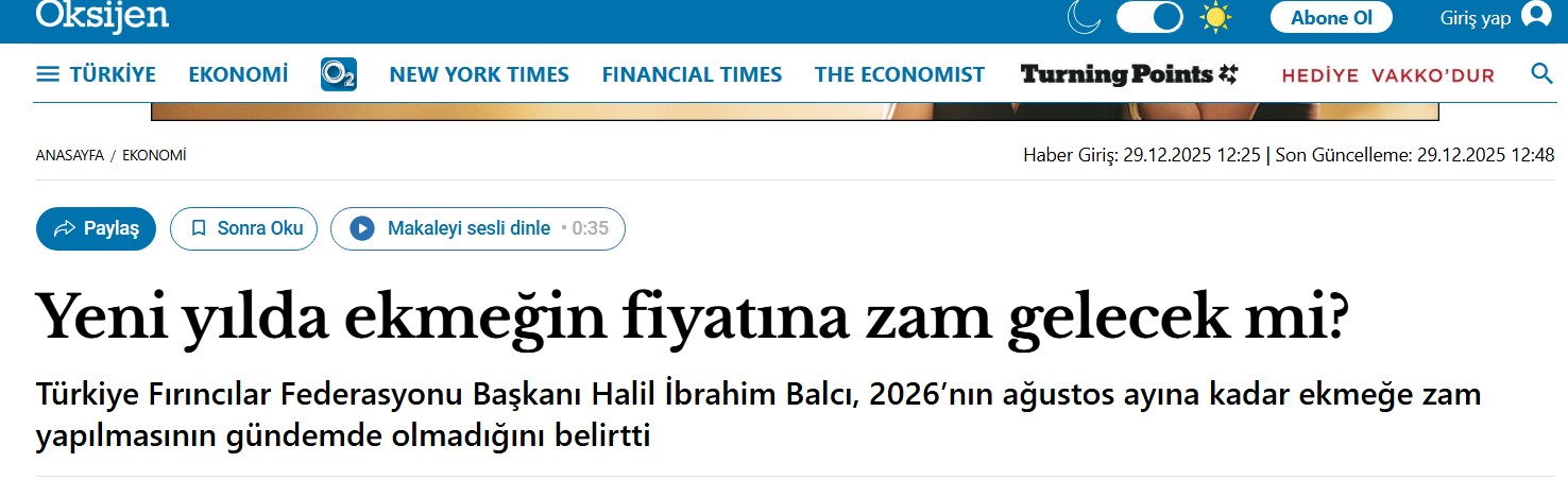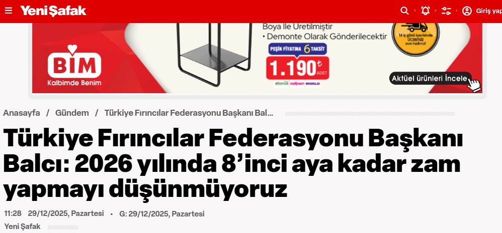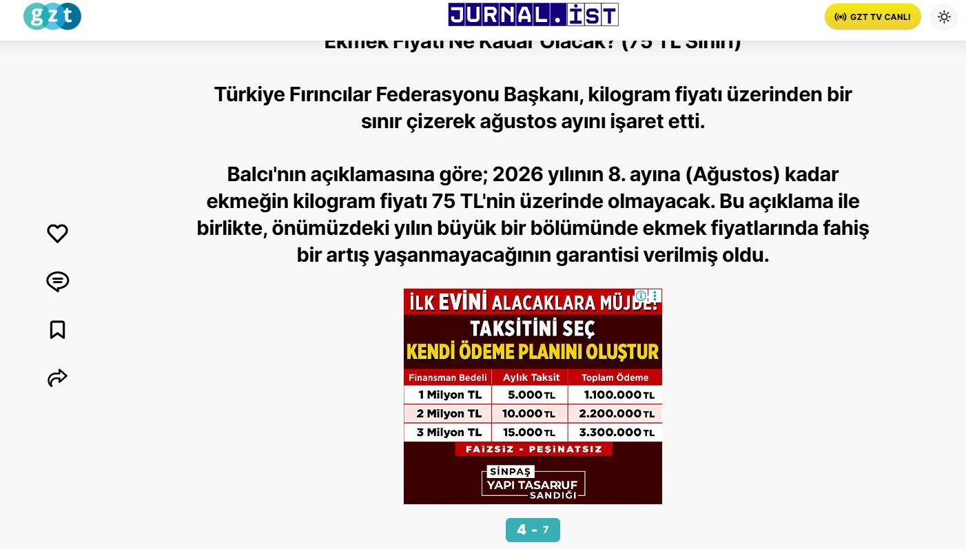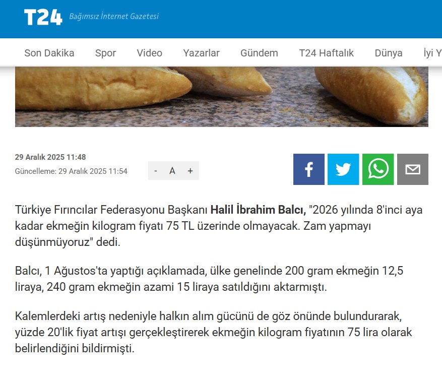 Türkiye Fırıncılar Federasyonu Başkanı Halil İbrahim Balcı ekmek zammına ilişkin dün yaptığı açıklamada, "Bugün itibariyle ekmekte ülke genelinde 8'nci aydan itibaren uygulanan kilogram fiyatı 75 liranın üzerinde olmayacak. 75 liranın altında olan 4 aydır fiyatına gelen farkla yansıtmayan illerimiz bunu yansıtabilirler. Ama 8'nci aydan itibaren işte örnek verecek olursak İzmir'de, Bursa'da, Ankara'da, İstanbul'da, Kocaeli'nde, Sakarya'da birçok vilayette uygulanan fiyat aynı 75 lira olarak devam edecek" ifadelerini kullandı. Bu haber medya kuruluşlarında, "2026 yılında 8’inci aya kadar zam yapmayı düşünmüyoruz" şeklinde yer aldı.