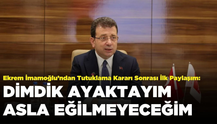 İstanbul Büyükşehir Belediye Başkanı Ekrem İmamoğlu, hakkında verilen tutuklama kararı sonrası sosyal medya hesabı üzerinden bir açıklama yaptı. İmamoğlu, "Dimdik ayaktayım, asla eğilmeyeceğim" ifadelerini kullandı.