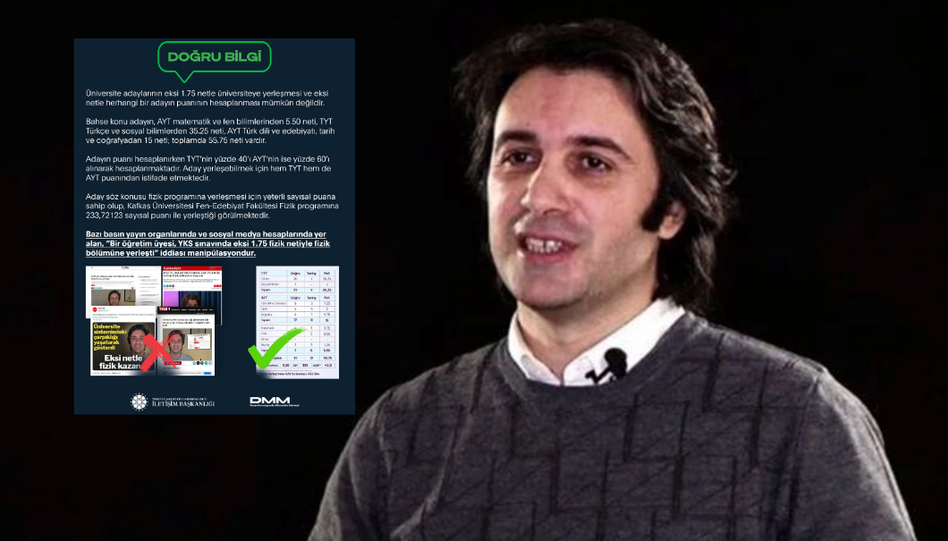 "Bazı basın yayın organlarında ve sosyal medya hesaplarında yer alan, “Bir öğretim üyesi, YKS sınavında eksi 1.75 fizik netiyle fizik bölümüne yerleşti” iddiası manipülasyondur.