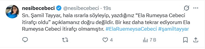 "Medyada konuşulan şeylerin yüzde 99'u gerçek değil. Özellikle basına çok bozulmuş, o kadar doğru değil ki, isimleri de zikredin lütfen diyor. Şamil Tayyar 'İtirafçı oldu, savcının yanında' dediğinde ben Silivri'deydim, Ela avukatıyla görüşüyordu. Şok oldum' dedi.
