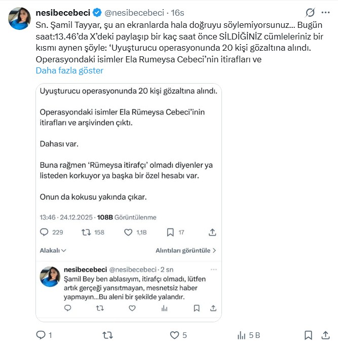 Uyuşturucu soruşturmasında tutuklanan Ela Rümeysa Cebeci'nin ablası konuştu. Nevşin Mengü’ye açıklamalarda bulunan abla, kendi sosyal medya hesabından da paylaşımlarda bulundu.
