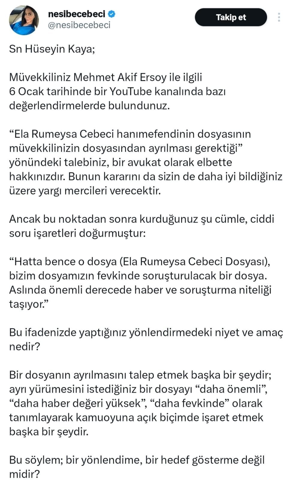 Mehmet Akif Ersoy’un avukatı Hüseyin Kaya’nın bir Youtube kanalında müvekkilinin dosyasının Ele Rümeysa Cebeci dosyasından ayrılması gerektiğini söylediğini ve “Hatta bence o dosya (Ela Rumeysa Cebeci Dosyası), bizim dosyamızın fevkinde soruşturulacak bir dosya. Aslında önemli derecede haber ve soruşturma niteliği taşıyor” ifadelerini kullandığını belirten Nesibe Cebeci, sosyal medya üzerinden Kaya’ya yanıt verdi.