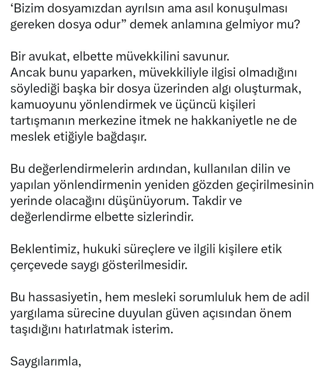 “Bu değerlendirmelerin ardından, kullanılan dilin ve yapılan yönlendirmenin yeniden gözden geçirilmesinin yerinde olacağını düşünüyorum. Takdir ve değerlendirme elbette sizlerindir. Beklentimiz, hukuki süreçlere ve ilgili kişilere etik çerçevede saygı gösterilmesidir. Bu hassasiyetin, hem mesleki sorumluluk hem de adil yargılama sürecine duyulan güven açısından önem taşıdığını hatırlatmak isterim. Saygılarımla.”
