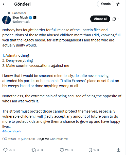 Epstein’in partilerine katılmadığını söyleyen Musk, ““Lolita Express” uçağında bulunmadığım, onun korkunç adasında ayak basmadığım ya da hiçbir yanlış yapmadığım halde, sürekli olarak lekeleneceğimi biliyordum” açıklamasında bulundu.