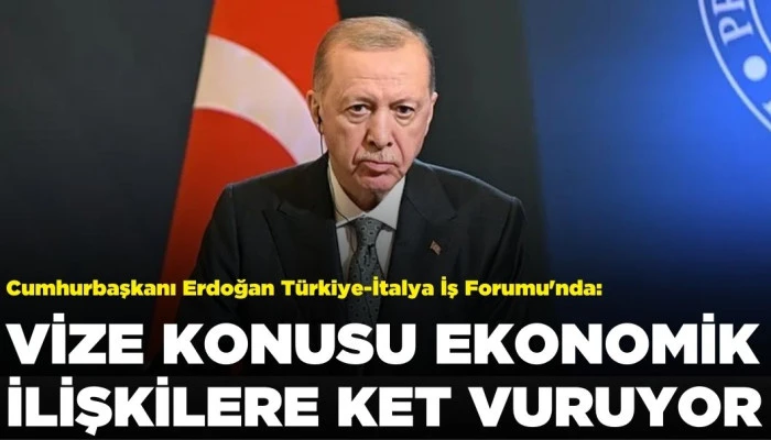 Cumhurbaşkanı Recep Tayyip Erdoğan, Türkiye-İtalya İş Forumu'nda konuştu. Erdoğan, vize konusuna değinerek, "İş dünyamızın vize konusunda yaşadıkları güçlüklerin ekonomik ilişkilerimize ket vurduğunu görüyoruz. İtalyan iş çevrelerini Avrupa Birliği kurumları nezdinde bu konuyu gündeme getirmelerinin iki tarafın da yararına olacağını düşünüyorum." dedi.