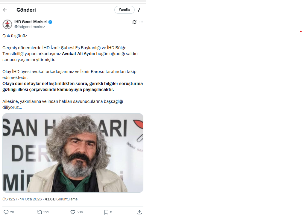 "Geçmiş dönemlerde İHD İzmir Şubesi Eş Başkanlığı ve İHD Bölge Temsilciliği yapan arkadaşımız avukat Ali Aydın bugün uğradığı saldırı sonucu yaşamını yitirmiştir. Olay İHD üyesi avukat arkadaşlarımız ve İzmir Barosu tarafından takip edilmektedir. Olaya dair detaylar netleştirildikten sonra, gerekli bilgiler soruşturma gizliliği ilkesi çerçevesinde kamuoyuyla paylaşılacaktır. Ailesine, yakınlarına ve insan hakları savunucularına başsağlığı diliyoruz."